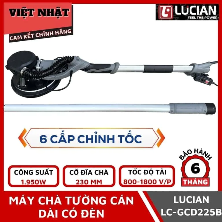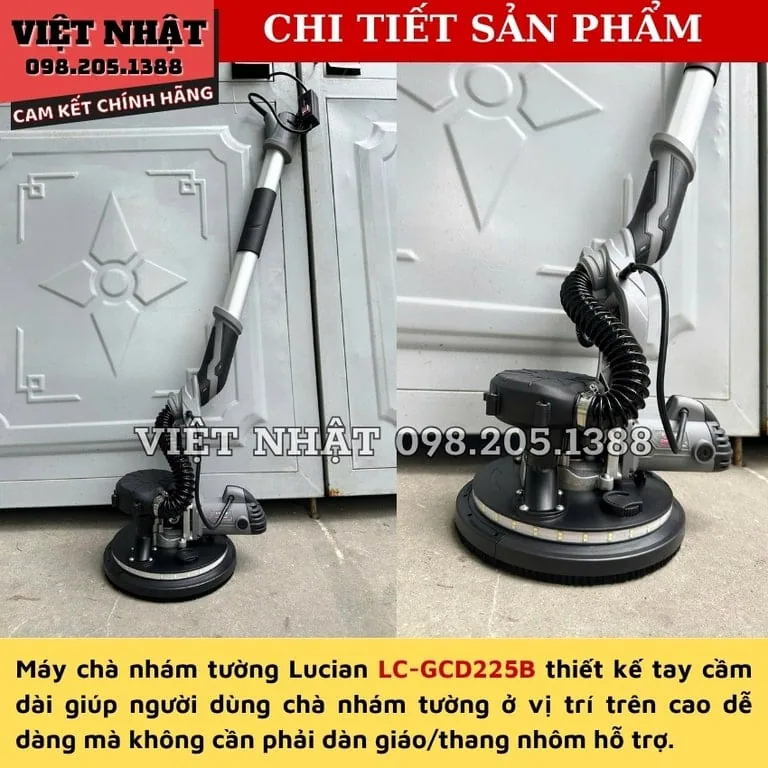 Máy chà nhám tường Lucian LC-GCD225B thiết kế tay cầm dài giúp người dùng chà nhám tường ở vị trí trên cao dễ dàng mà không cần phải dàn giáo/thang nhôm hỗ trợ.