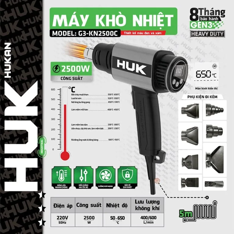 Điều chỉnh nhiệt độ linh hoạt: Phạm vi nhiệt độ từ 50°C – 650°C, phù hợp với mọi nhu cầu từ nhẹ nhàng đến chuyên sâu.