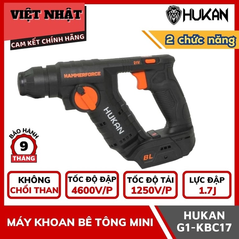 - Máy khoan bê tông mini 2 chức năng Hukan G1-KBC17 cung cấp 2 chế độ khoan khác nhau: khoan thường và khoan búa.