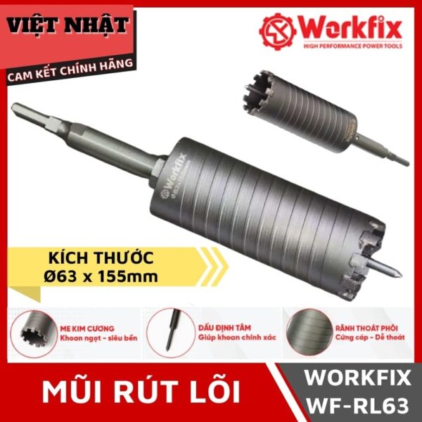 Sản phẩm phù hợp cho các công việc khoan đòi hỏi độ chính xác cao. Sử dụng mũi rút lõi Workfix WF-RL63 để đạt kết quả tốt nhất. 🛠️