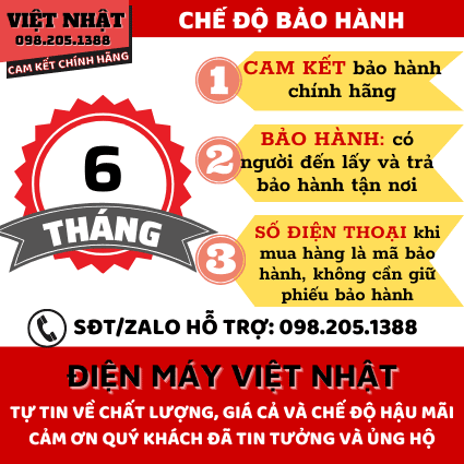 - Máy được bảo hành 06 tháng chính hãng, trong thời gian bảo hành, nếu máy có vấn đề, quý khách chỉ cần gọi tới hotline 092.375.6688, đọc số điện thoại khi quý khách mua hàng, ĐIện Máy Việt Nhật sẽ cho shipper vào tận nơilấy hàng lỗi mang đi sửa cho quý khách, và khi sửa xong sẽ lại có shipper mang trả hàng đến tận tay quý khách, chi phí phát sinh trong thời gian bảo hành, Điện Máy Việt Nhật sẽ hoàn toàn chịu, khách hàng sẽ không phải mang hàng đi đâu và không mất bất cứ chi phí gì vì phương châm của chúng tôi là: “Làm sao để cho khách hàng thoải mái và yên tâm nhất khi mua hàng cũng như sau khi mua”